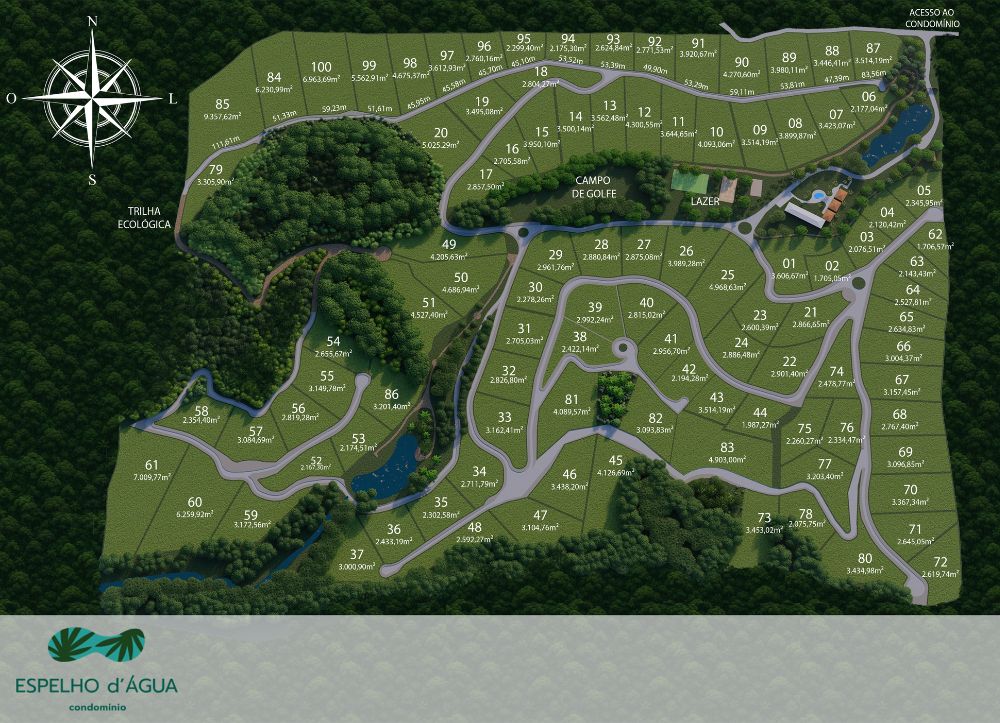 O Condomínio Espelho d’Água foi pensado e construído para oferecer a perfeita integração com a natureza sem deixar de lado todo o conforto e tecnologia necessários. As quintas (terrenos) foram distribuídas de modo a valorizar a beleza da paisagem e das vistas, e preservar a privacidade e a segurança das famílias, por meio das cercas vivas.