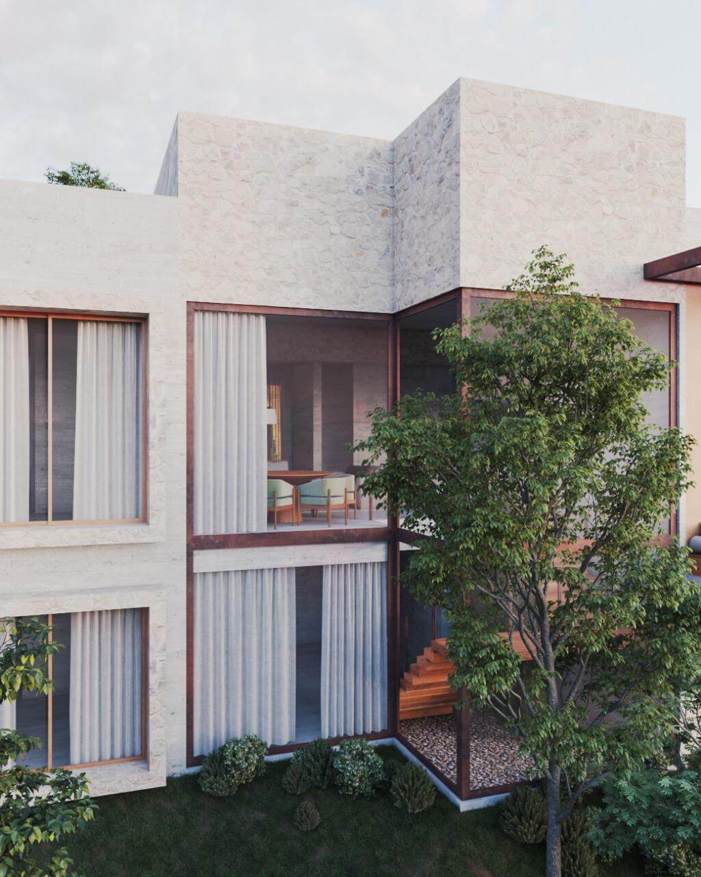 "Para projetar esta casa, criamos um perfil imaginário de uma família que goste de desfrutar de momentos especiais na companhia dos amigos e parentes." A arquiteta se propôs a desenvolver um layout versátil capaz de atender as mais variadas demandas familiares. Para que o projeto seja único, ele traz também uma série de diferenciais como a bombfire, o ateliê para hobbies diversos, uma sala de degustação e adega. São ambientes que proporcionarão um convívio especial e prometem surpreender aos mais exigentes perfis de clientes. A escolha dos materiais priorizou as texturas terrosas, neutras e a pedra natural, de modo a estimular a tatilidade e reforçar o desejo de permanência. A iluminação natural foi uma das grandes aliadas, banhando todos os ambientes e proporcionando o aconchego tão desejado em locais onde as temperaturas são mais baixas. Além disso, a inserção de jardins internos reforça a sensação de pertencimento e bem-estar que a natureza proporciona.