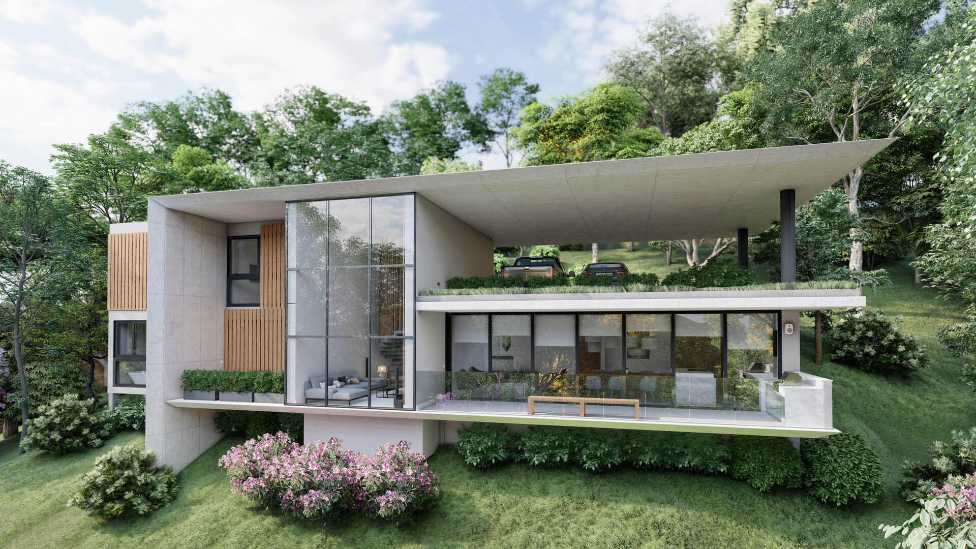 Alinhado ao novo platô na topografia do terreno, o pavimento inferior abriga a área íntima e social da casa, que se enraíza ao jardim externo através de grandes portas envidraçadas transformando a parte social num extenso terraço contemplativo. O telhado do pavimento inferior é usado como base para o mirante do pavimento térreo, com cobertura verde auxiliando nas condicionantes térmicas.